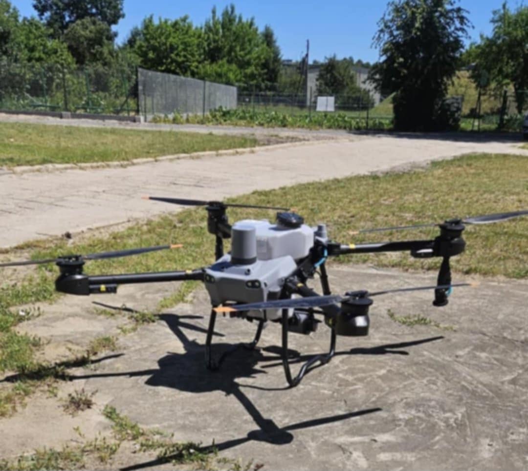 - nowoczesnego drona rolniczego do wykonywania zabiegów ochrony roślin, ze zbiornikami na ciecz ze środkiem do oprysków, kamerami, panelem sterowania, stacjami ładującymi akumulatory oraz przyczepą do przewozu na miejsce wykorzystania,
