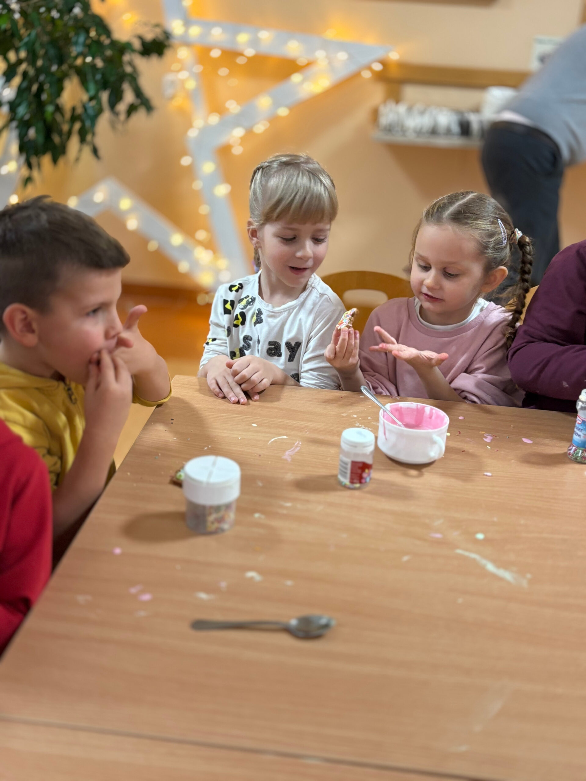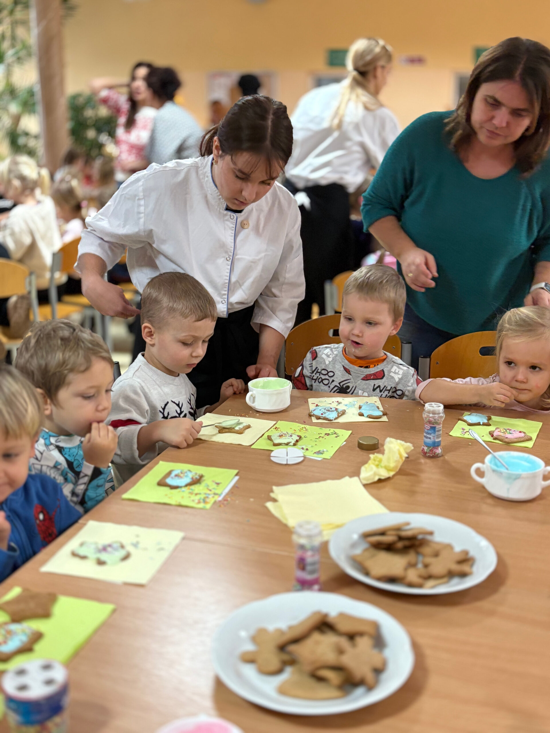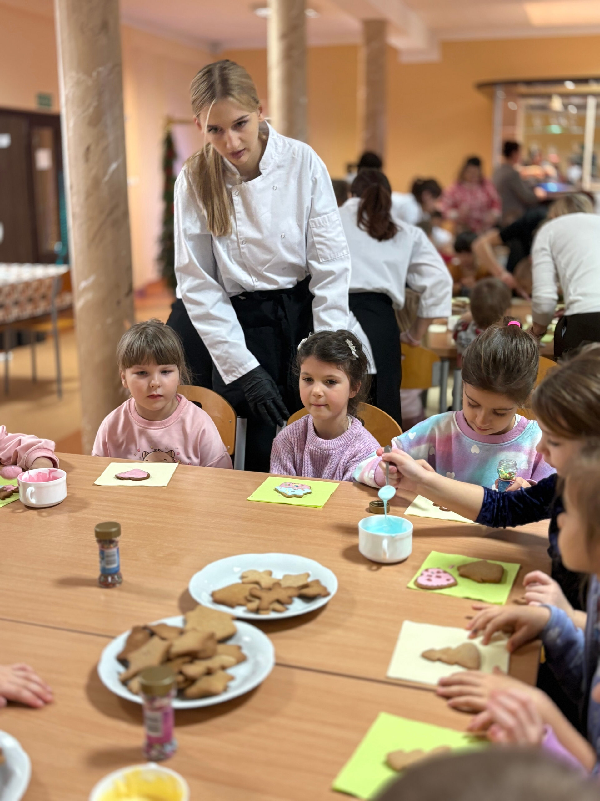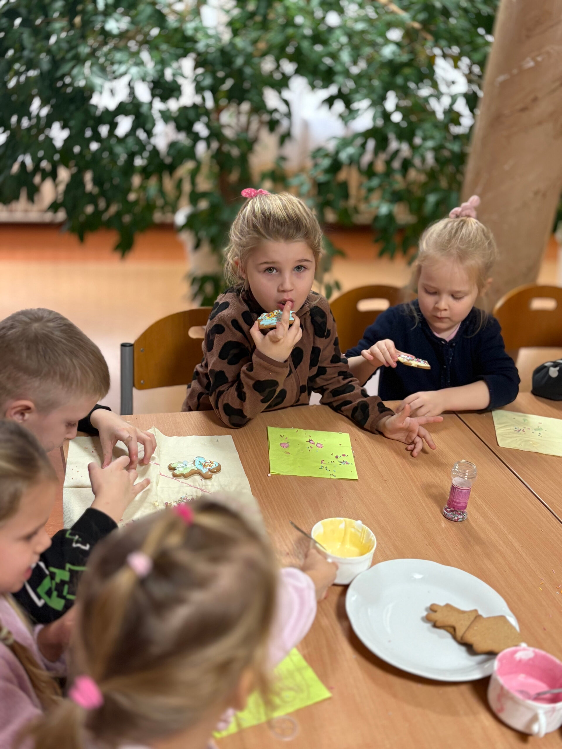 Dzieci ozdabiały ciastka według własnych pomysłów, używając do tego kolorowej polewy i różnego rodzaju posypek. Warsztaty z dekorowania pierników – przygotowanych, w ramach zajęć praktycznych, przez uczniów Technikum w zawodzie technik żywienia i usług gastronomicznych – sprawdziły się świetnie w okresie zbliżających się Świąt Bożego Narodzenia. Ostatnią atrakcją spotkania była wizyta Świętego Mikołaja, który obejrzał udekorowane przez dzieci wypieki, wysłuchał wierszy oraz pięknie zaśpiewanych kolęd.
