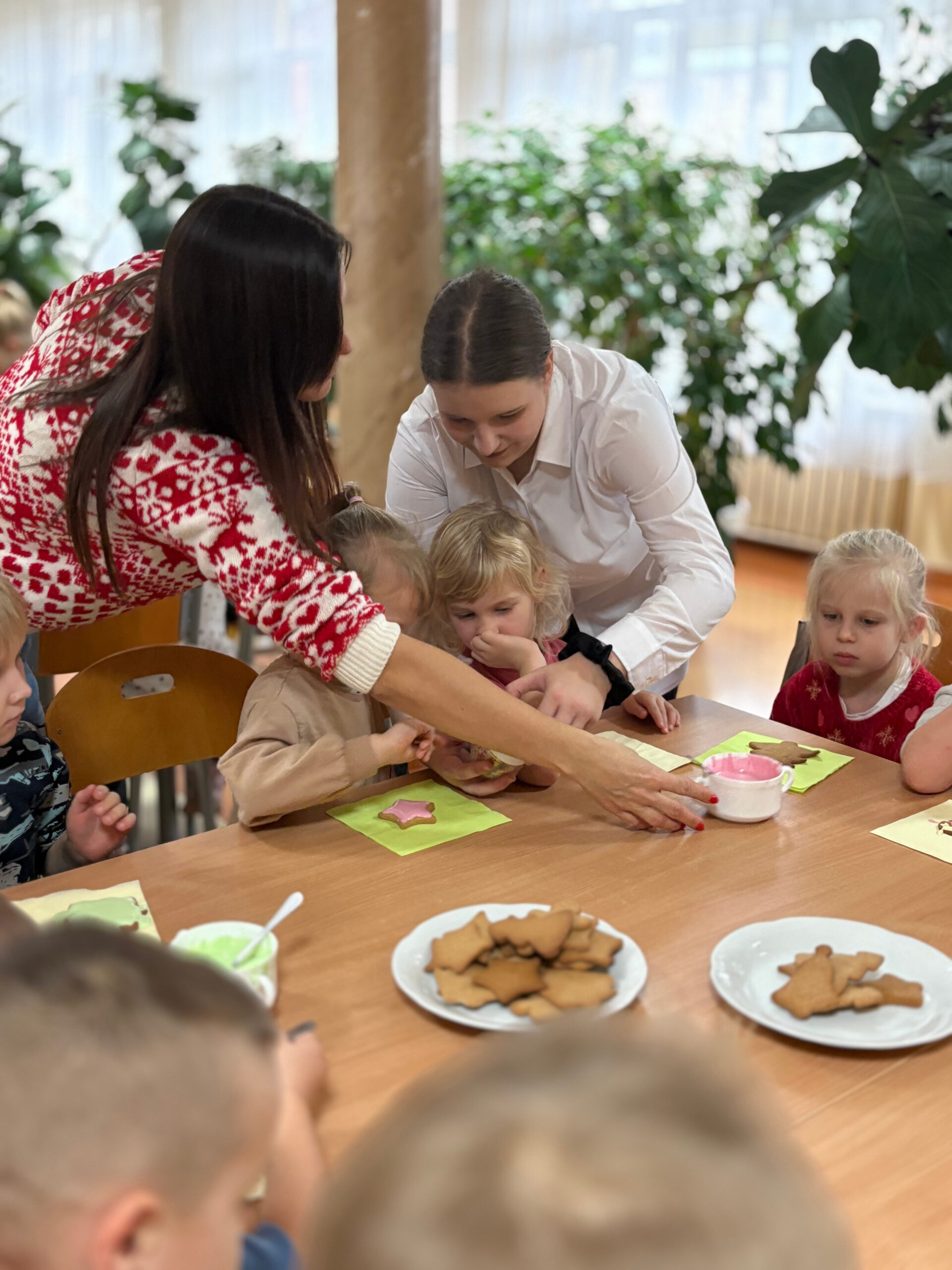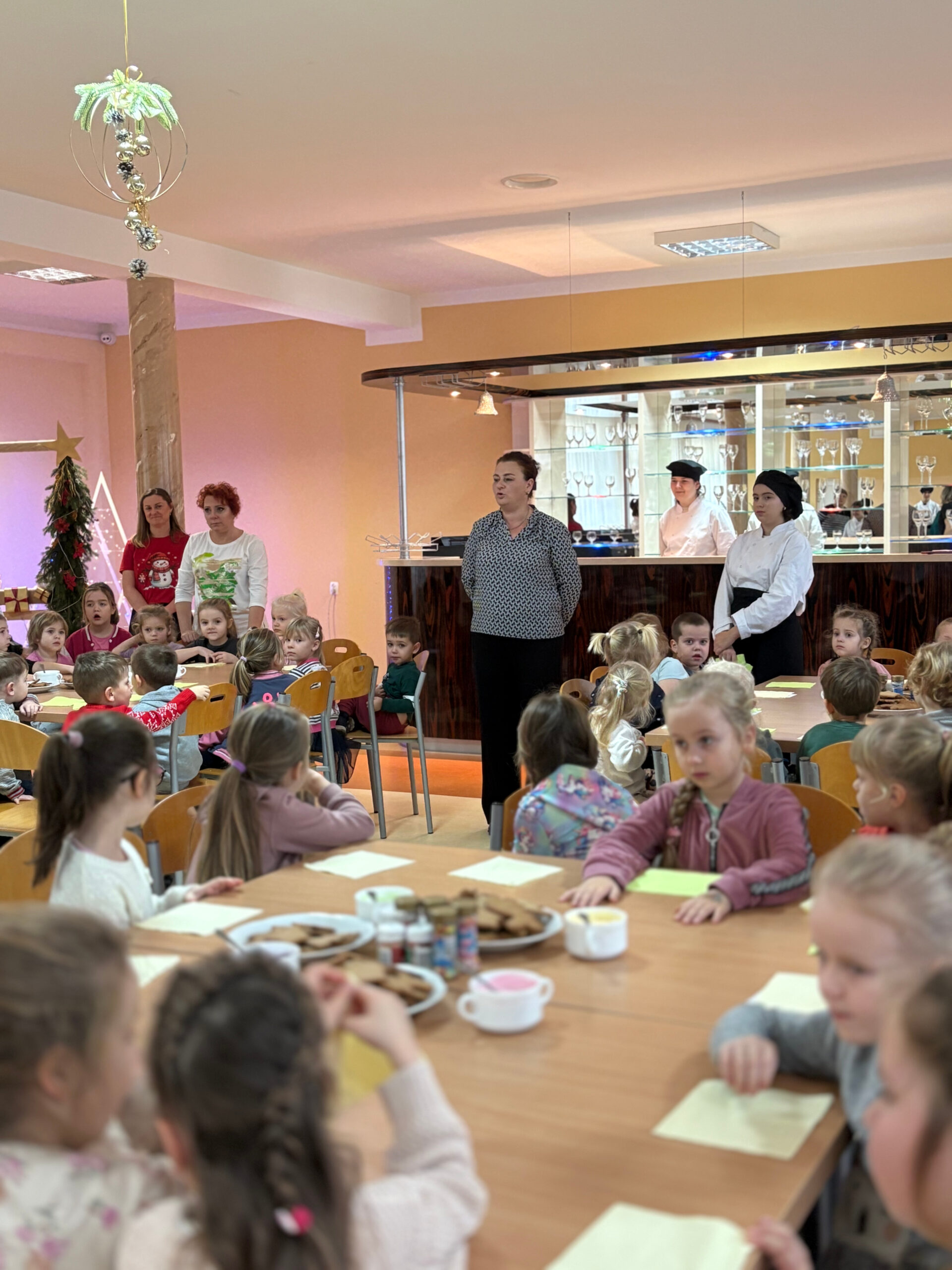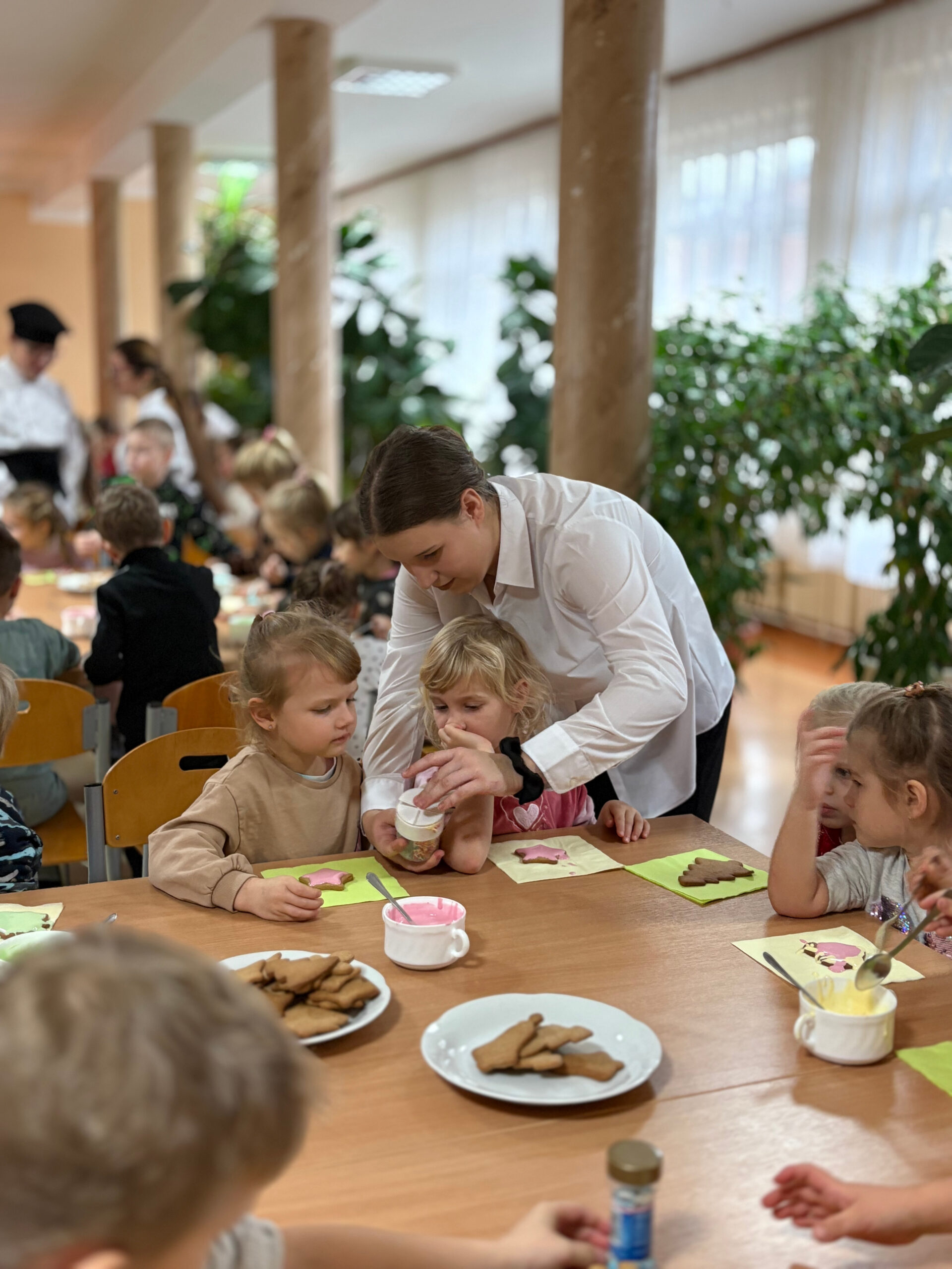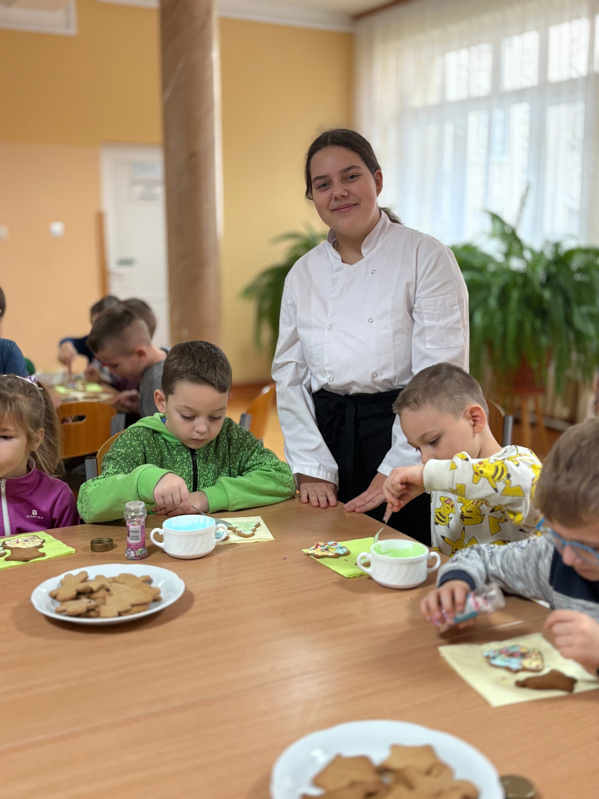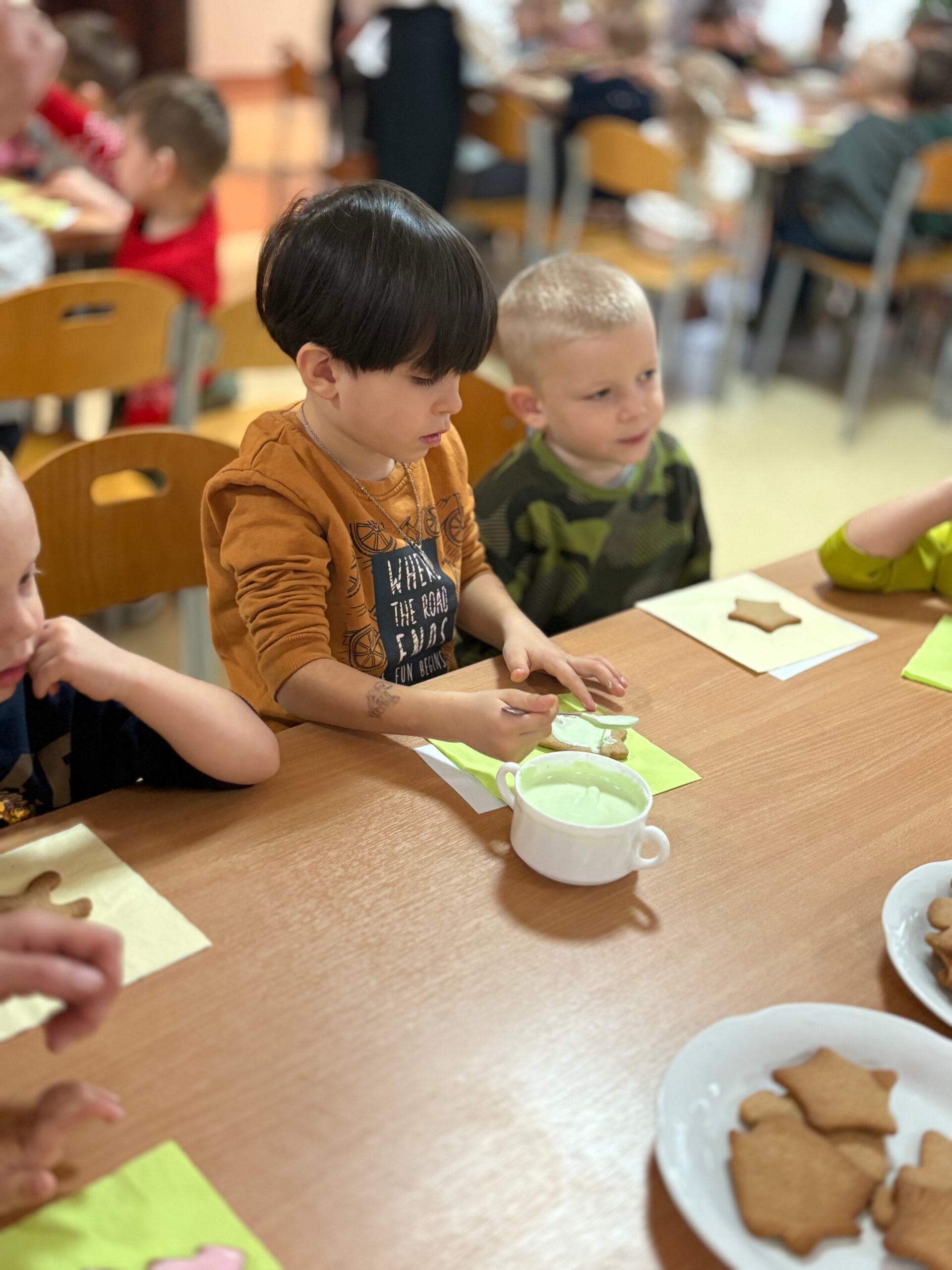 Dzieci ozdabiały ciastka według własnych pomysłów, używając do tego kolorowej polewy i różnego rodzaju posypek. Warsztaty z dekorowania pierników – przygotowanych, w ramach zajęć praktycznych, przez uczniów Technikum w zawodzie technik żywienia i usług gastronomicznych – sprawdziły się świetnie w okresie zbliżających się Świąt Bożego Narodzenia. Ostatnią atrakcją spotkania była wizyta Świętego Mikołaja, który obejrzał udekorowane przez dzieci wypieki, wysłuchał wierszy oraz pięknie zaśpiewanych kolęd.