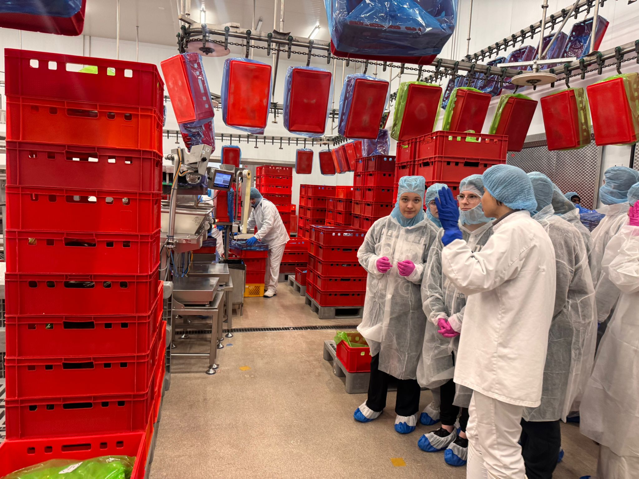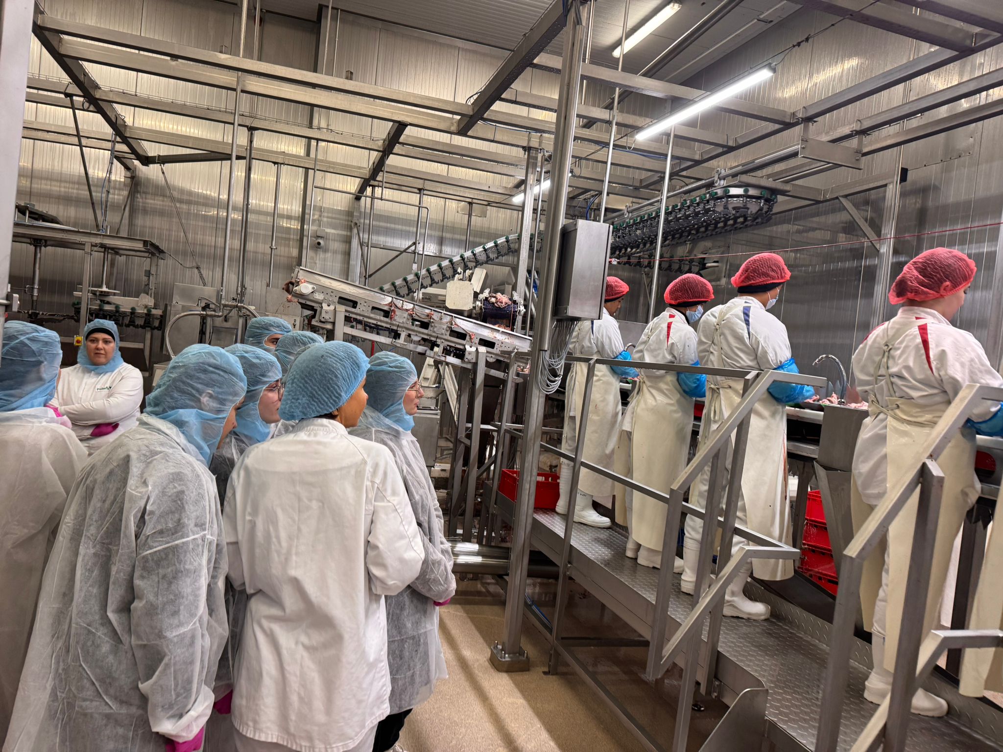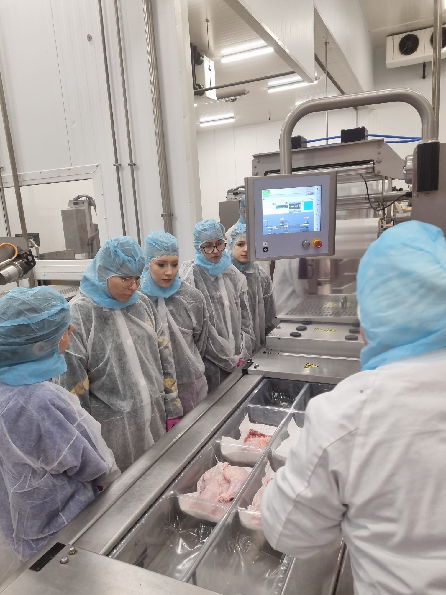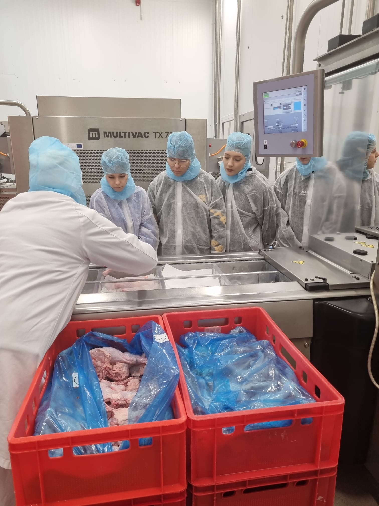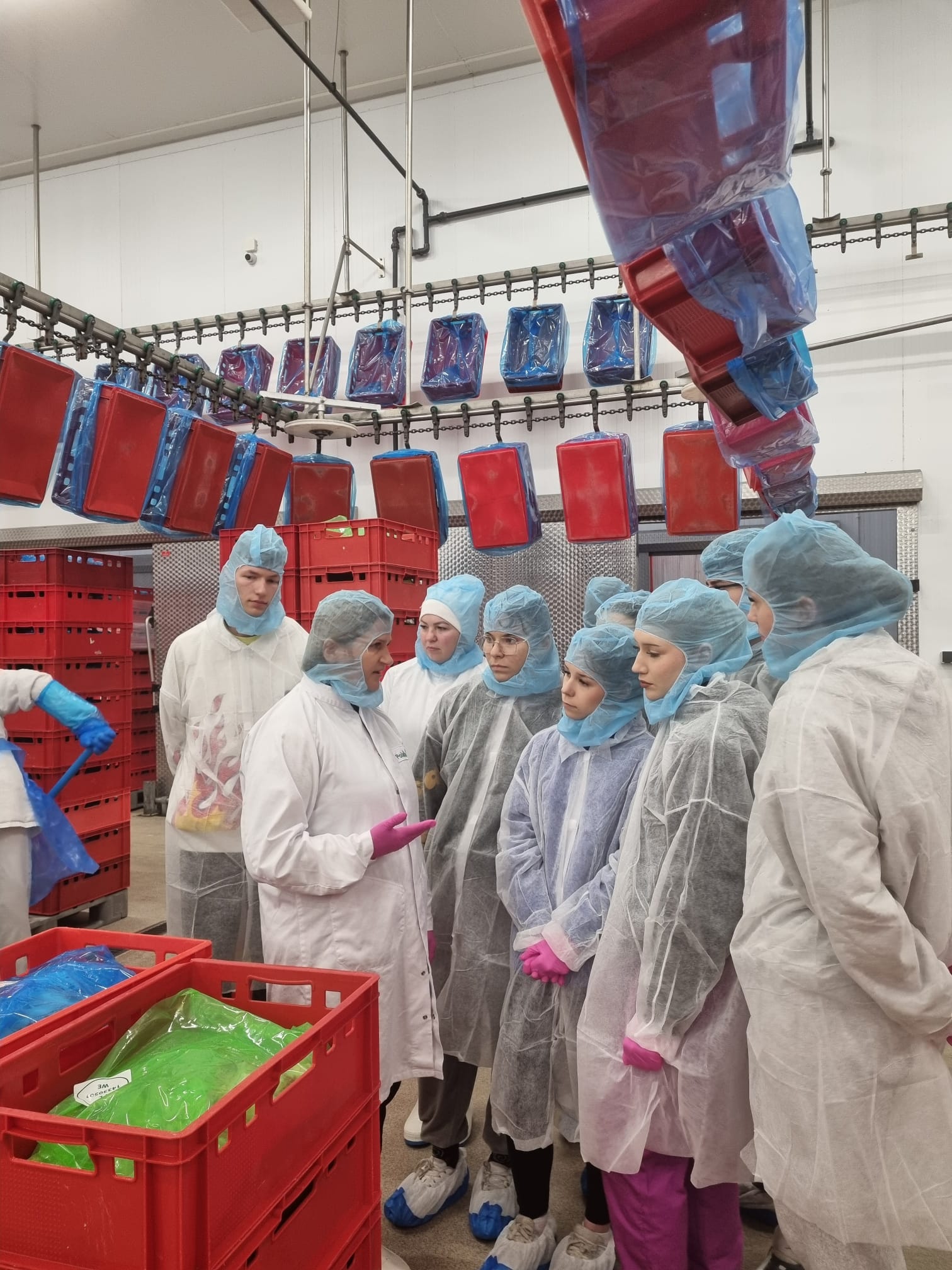 Po krótkim wstępie, udaliśmy się bezpośrednio na hale produkcyjne, gdzie zaczynając od części „ czystej” uczniowie mieli okazję zobaczyć na czym polega technologia rozbioru tuszek na poszczególne elementy, pakowanie i ekspedycja mięsa oraz poznali obowiązujące w zakładzie krytyczne punkty kontrolne odnośnie maksymalnej temperatury mięsa i sposoby ich weryfikacji.
