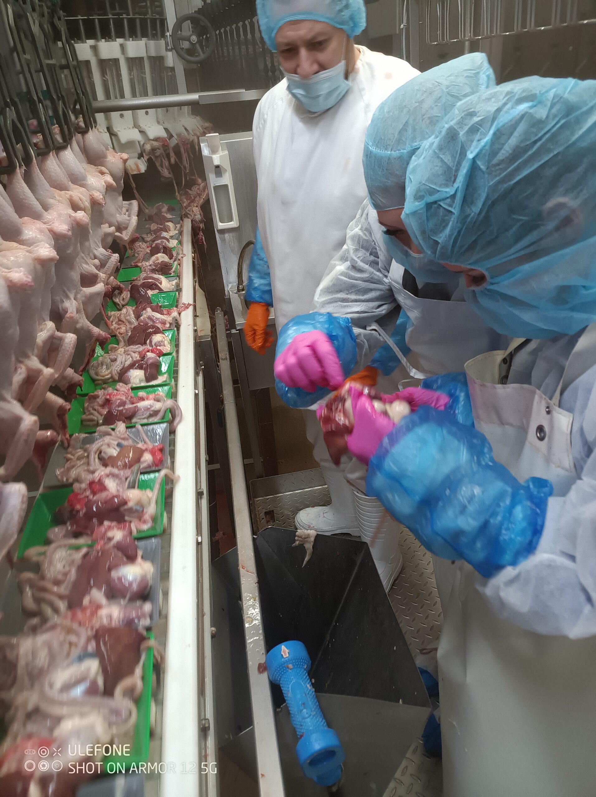 Omówione zostały szczegóły badania przed i poubojowego drobiu i w ostatnim etapie zajęć, każdy indywidualnie z lekarzem weterynarii wykonali badanie poubojowe drobiu zapoznając się z najczęstszymi zmianami dyskwalifikującymi mięso do spożycia przez ludzi.